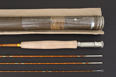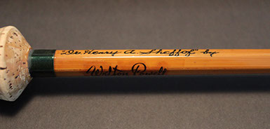 Has the red & gold uplocking “Featherweight” reel seat, which was standard for Walt’s rods of this era, and is in beautiful shape-6 ¾” E.C. Powell style grip in Ex Condition-Green wraps over medium toned cane-Chromed Perfection stripping & tip top guides-Snake guides are of the “No Foul” type-Butt is inscribed as follows: Made Especially For “Dr. Henry A. Sheffof” by Walton Powell-All sections are full length and straight with the exception of one of the tips that has a slight downward set approximately three quarters of the way up the shaft-Comes with original bag & tube (sorry cap is missing from tube as many of these early twist on caps are)-Overall Condition: Is Excellent ++